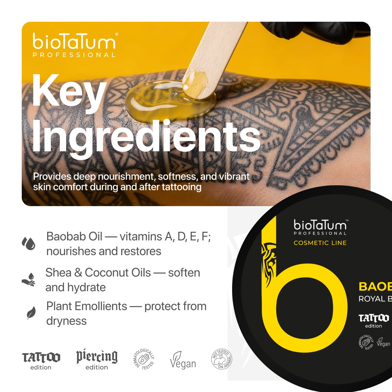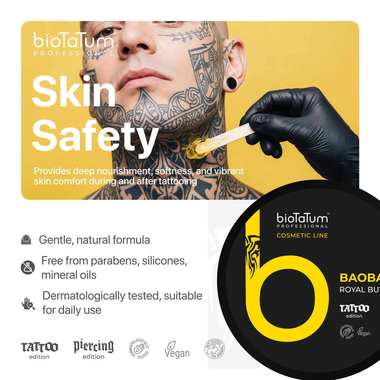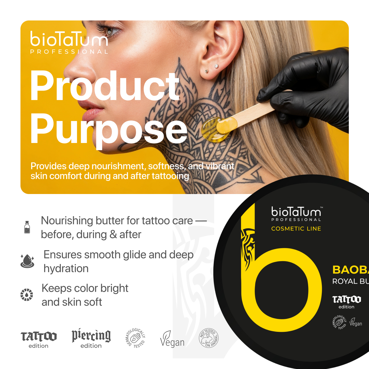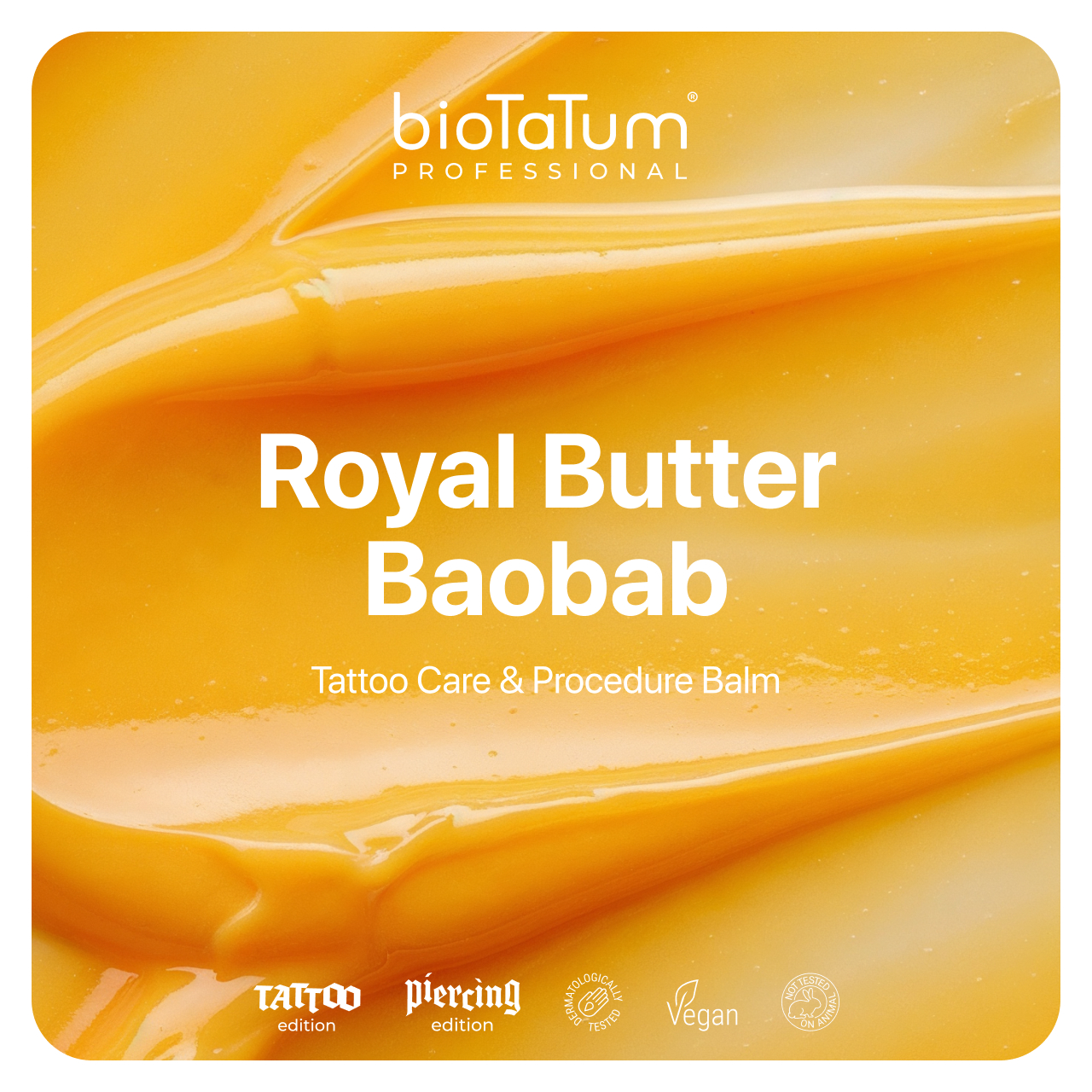 BioTaTum Royal Butter Baobab is a luxurious body butter formulated for intensive skin and tattoo care. Enriched with Baobab extract, Shea butter, and Vitamin E, it deeply nourishes, hydrates and restores comfort and elasticity to the skin.
