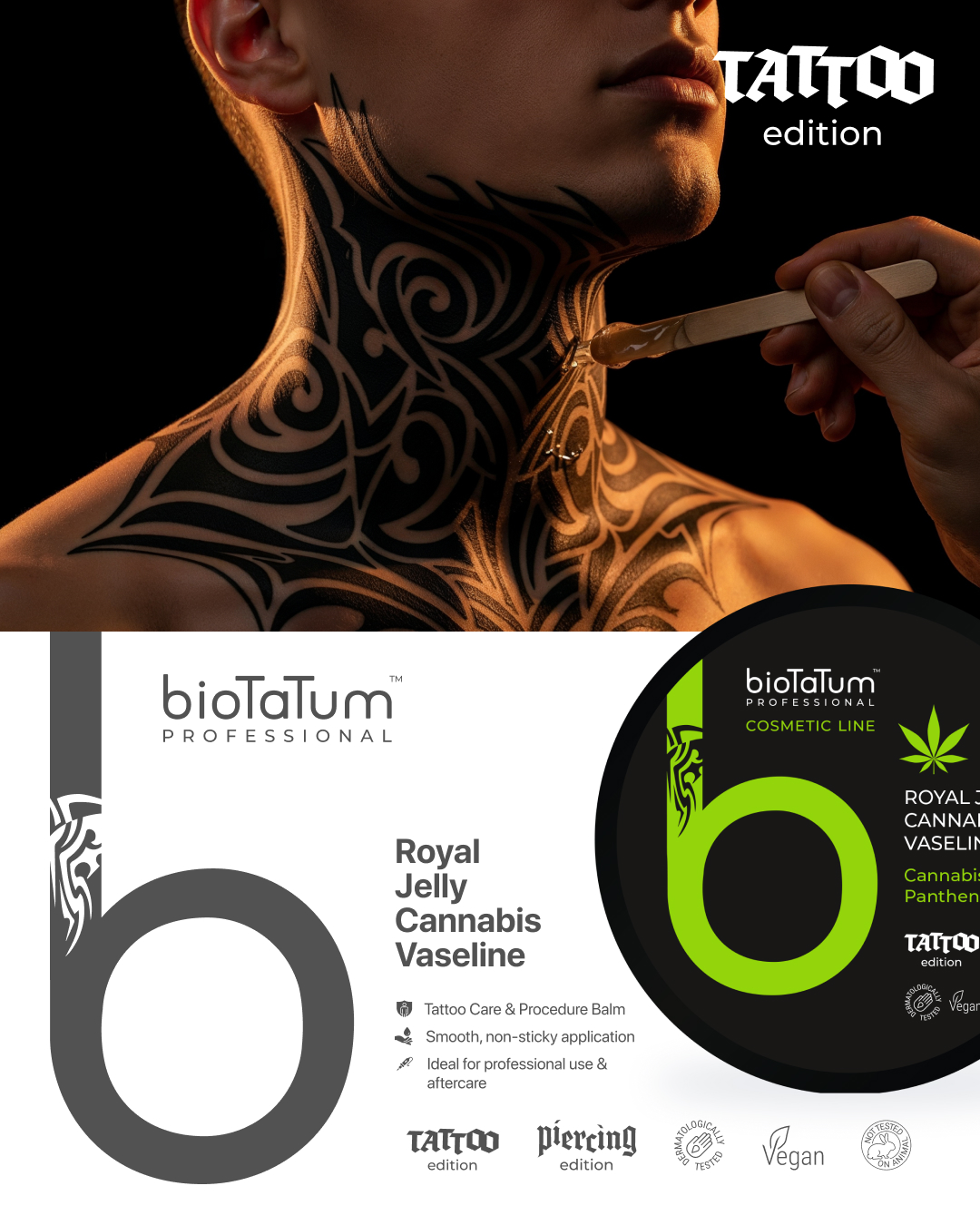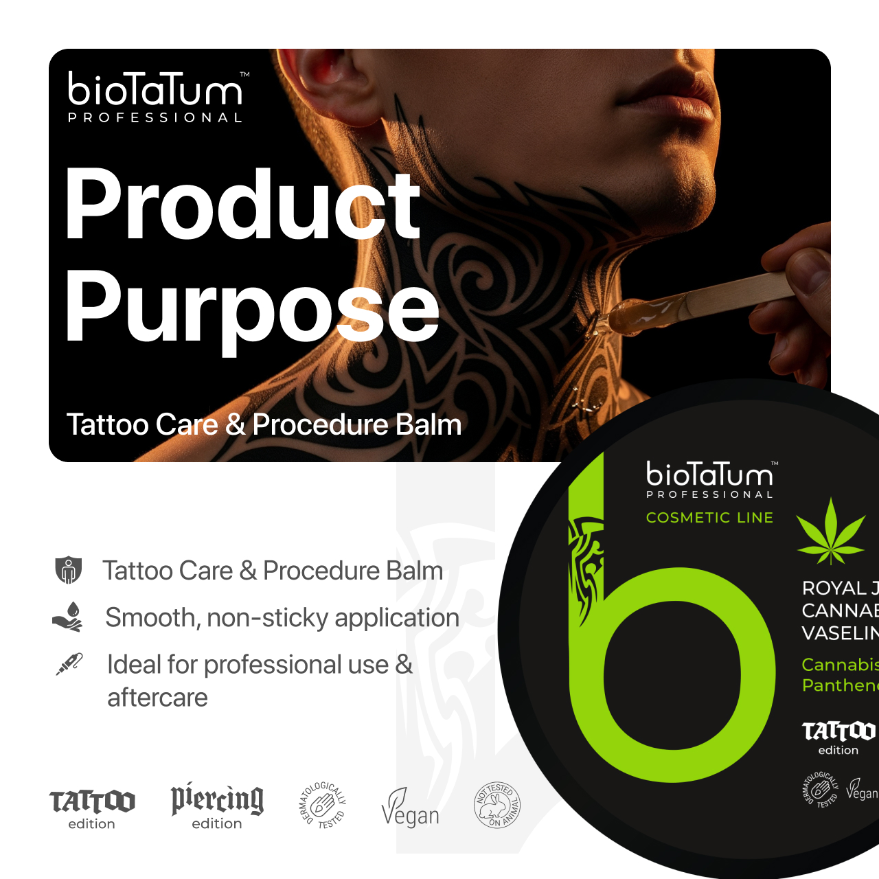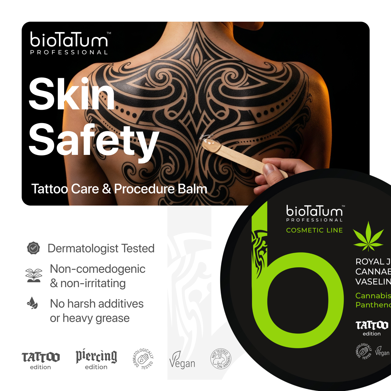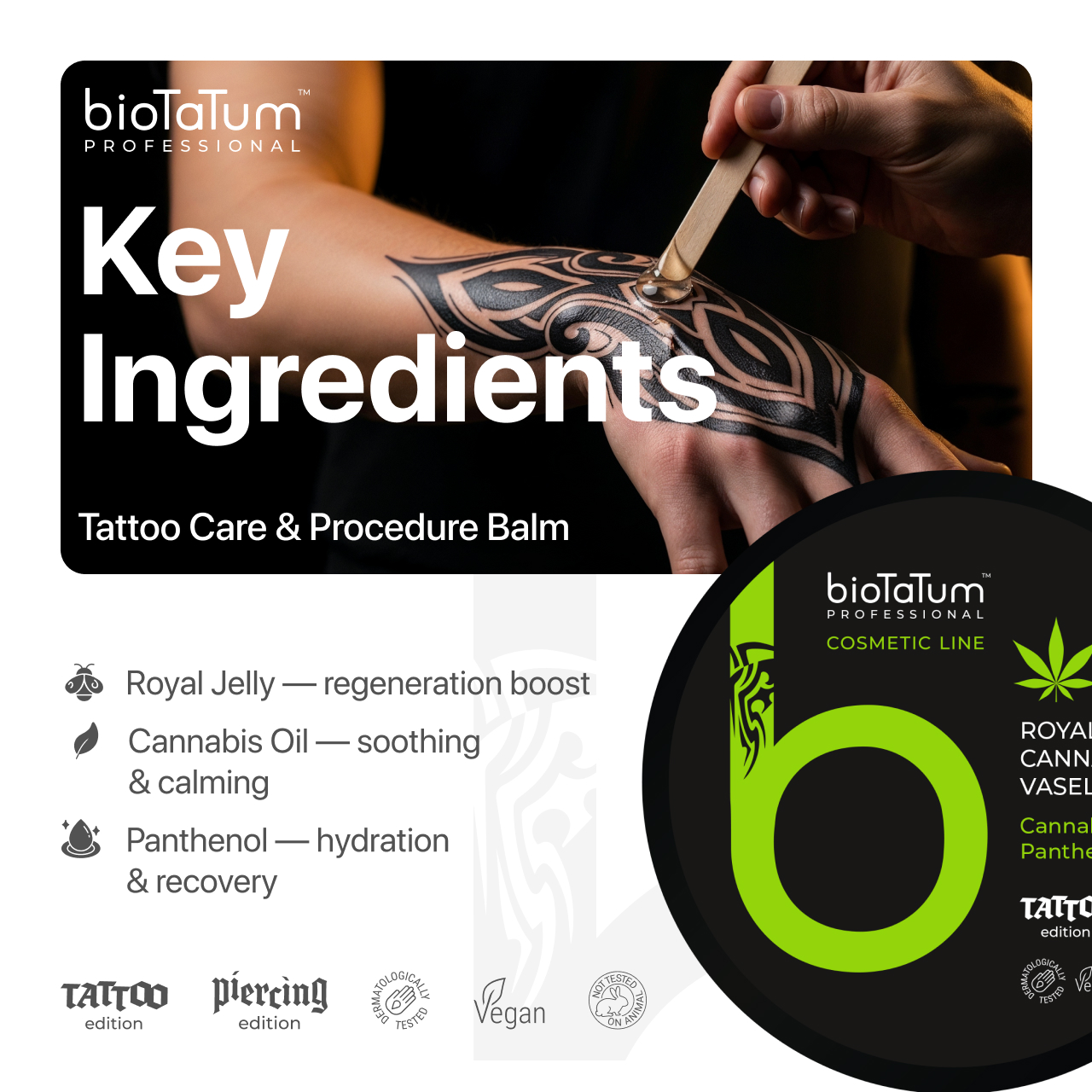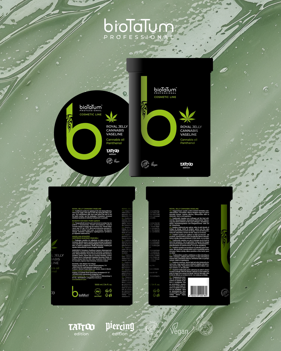 Professional petroleum jelly developed specifically for use during the tattooing process. Enriched with Shea Butter (Butyrospermum Parkii Butter), Hemp Seed Oil (Cannabis Sativa Seed Oil), and Panthenol, it effectively nourishes and protects the skin, helping to soothe irritation and prevent dryness.